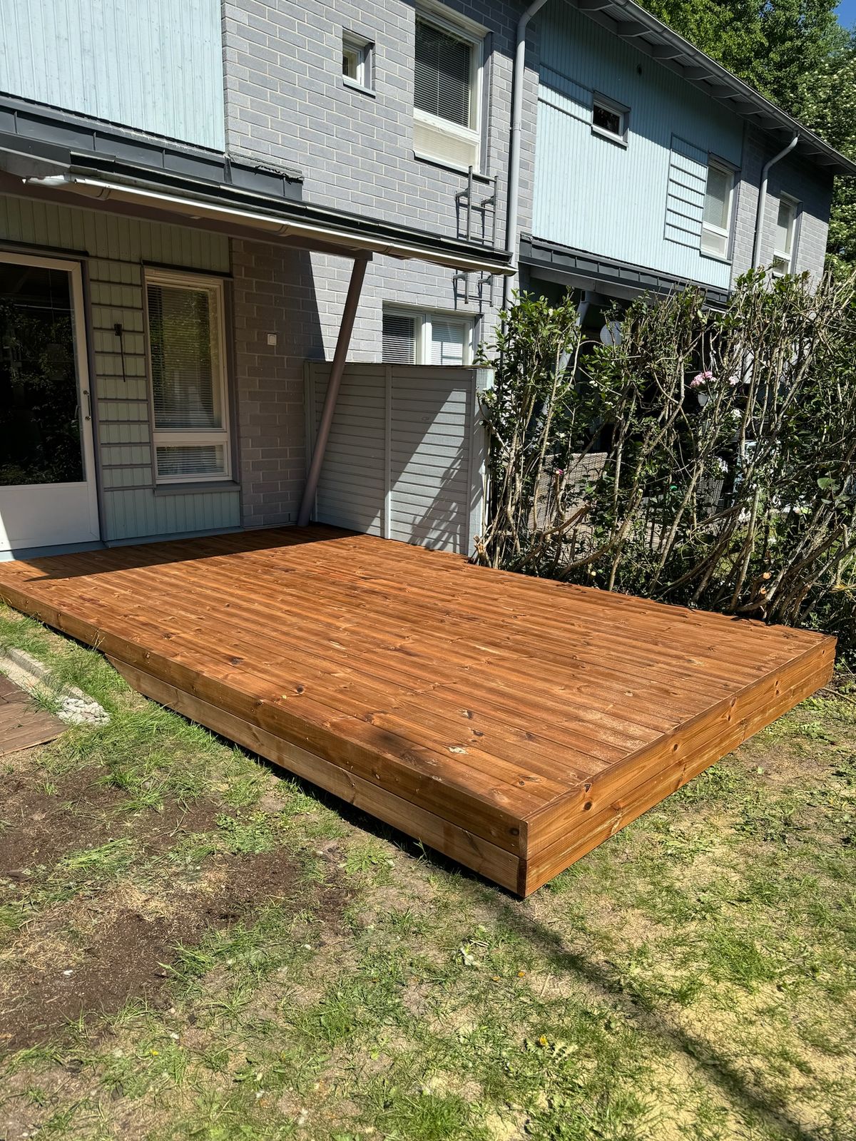 "Isot suositukset tälle! Saatiin iso terassimme uusittua alkukesästä ja taloon myös huolelliset huoltomaalaukset. Hienoa työtä, häkellyttävän ripeästi ja kaikki tismalleen kuten sovittiin ja erityistoiveetkin terassin ulkonäköön liittyen onnistuivat. Lopputulos on täydellinen!"